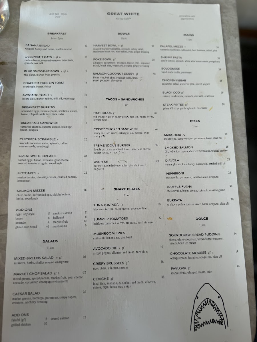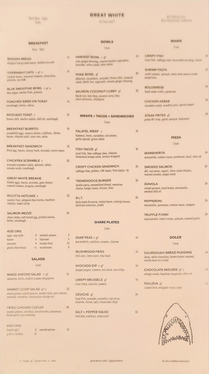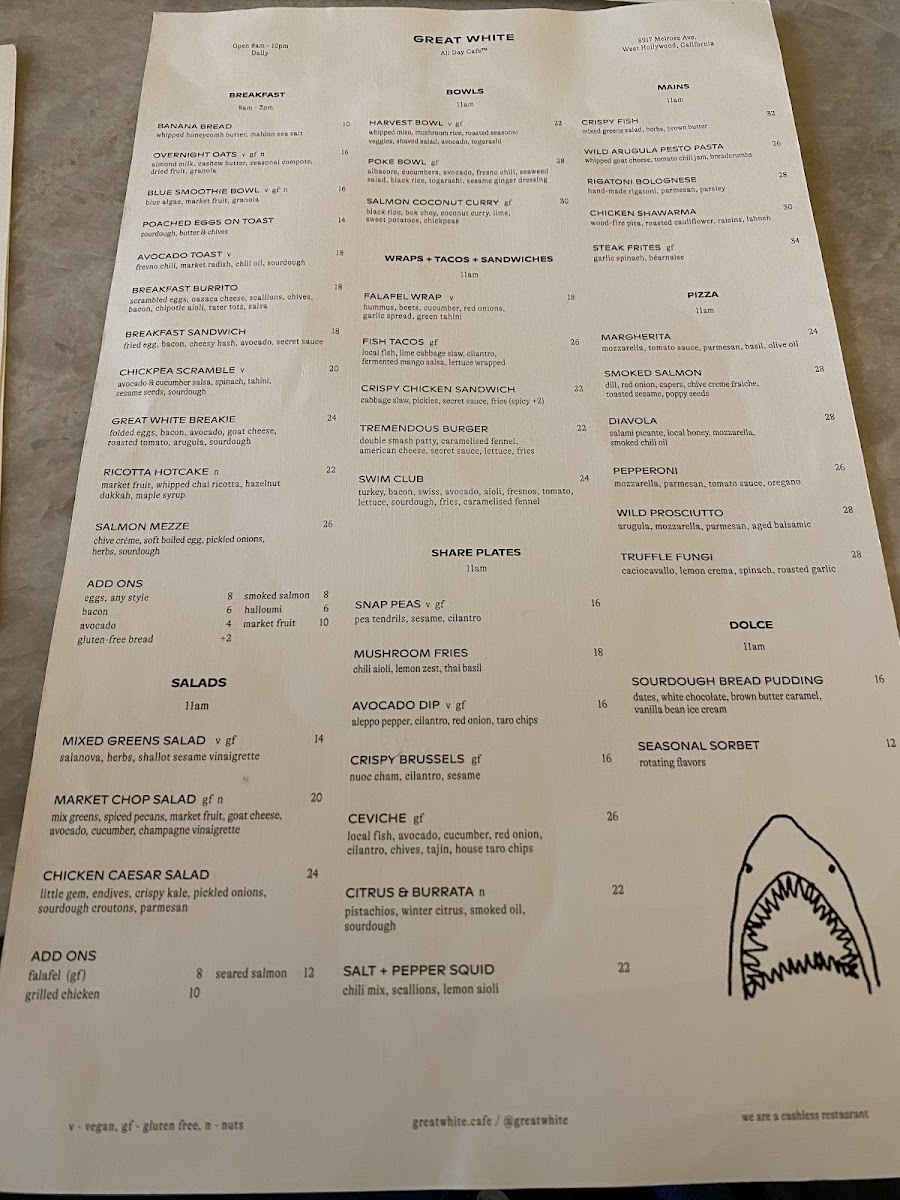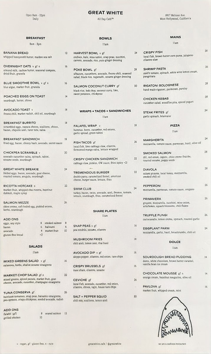 At Great White Menu, located at 8917 Melrose Ave, West Hollywood, CA, you’re in for a treat with a menu that perfectly blends casual dining and fresh, flavorful ingredients. From mouthwatering seafood to vibrant salads and everything in between, every dish is crafted to satisfy a range of tastes. Whether you’re in the mood for something light and refreshing or indulgent and hearty, there’s something here for everyone. The variety is impressive, with options that cater to both seafood lovers and those seeking plant-based alternatives. Enjoy the laid-back vibe of this spot while diving into a selection that’s both exciting and comforting at the same time. Each plate is thoughtfully prepared with high-quality ingredients, ensuring that your meal will leave you both satisfied and wanting more.