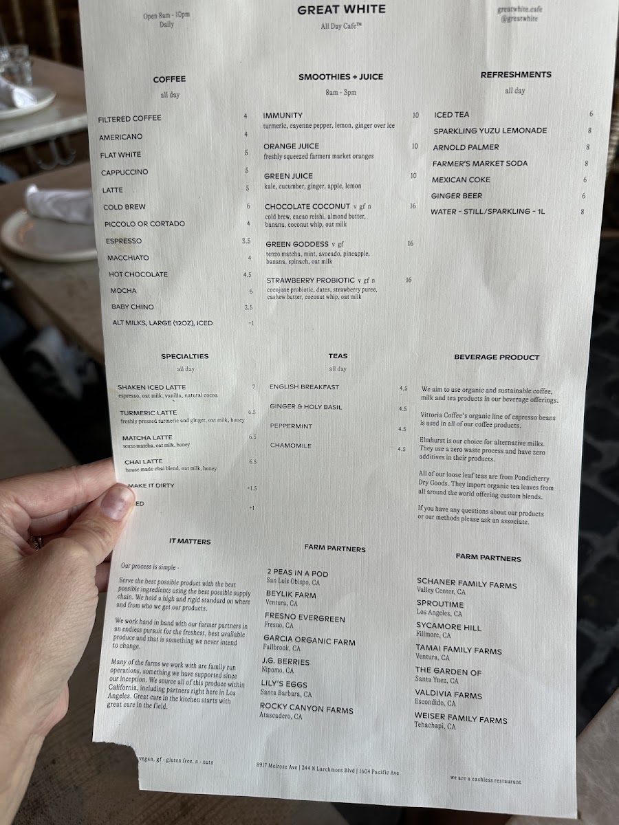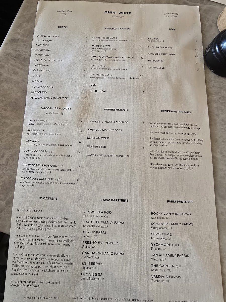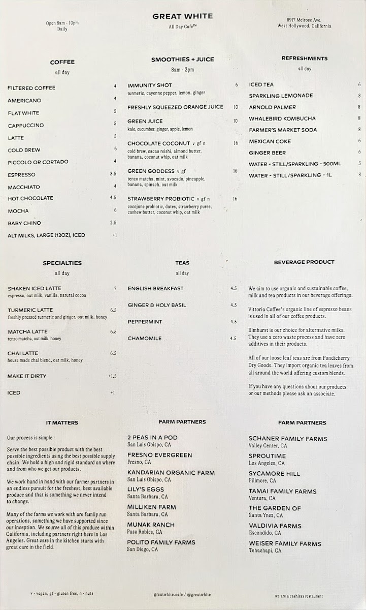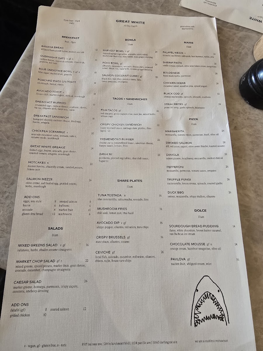 At Great White Menu, located at 8917 Melrose Ave, West Hollywood, CA, you’re in for a treat with a menu that perfectly blends casual dining and fresh, flavorful ingredients. From mouthwatering seafood to vibrant salads and everything in between, every dish is crafted to satisfy a range of tastes. Whether you’re in the mood for something light and refreshing or indulgent and hearty, there’s something here for everyone. The variety is impressive, with options that cater to both seafood lovers and those seeking plant-based alternatives. Enjoy the laid-back vibe of this spot while diving into a selection that’s both exciting and comforting at the same time. Each plate is thoughtfully prepared with high-quality ingredients, ensuring that your meal will leave you both satisfied and wanting more.